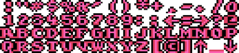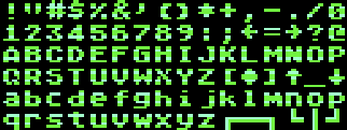 | Keypound | !"#$%^&’()×+-.✓0123456789:;←=→?@ABCDEFGHIJKLMNOPQRSTUVWXYZ[@]↑⎺↓abcdefghijklmnopqrstuvwxyz┌─┐│└┘ | 8×8 | 3 colors |